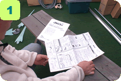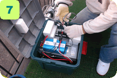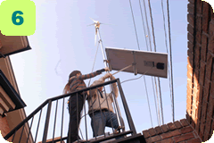 各パイプをマニュアルにしたがって組立て、発電機本体にプロペラを取り付けます。(この作業は必ず2人以上で行ってください。) |